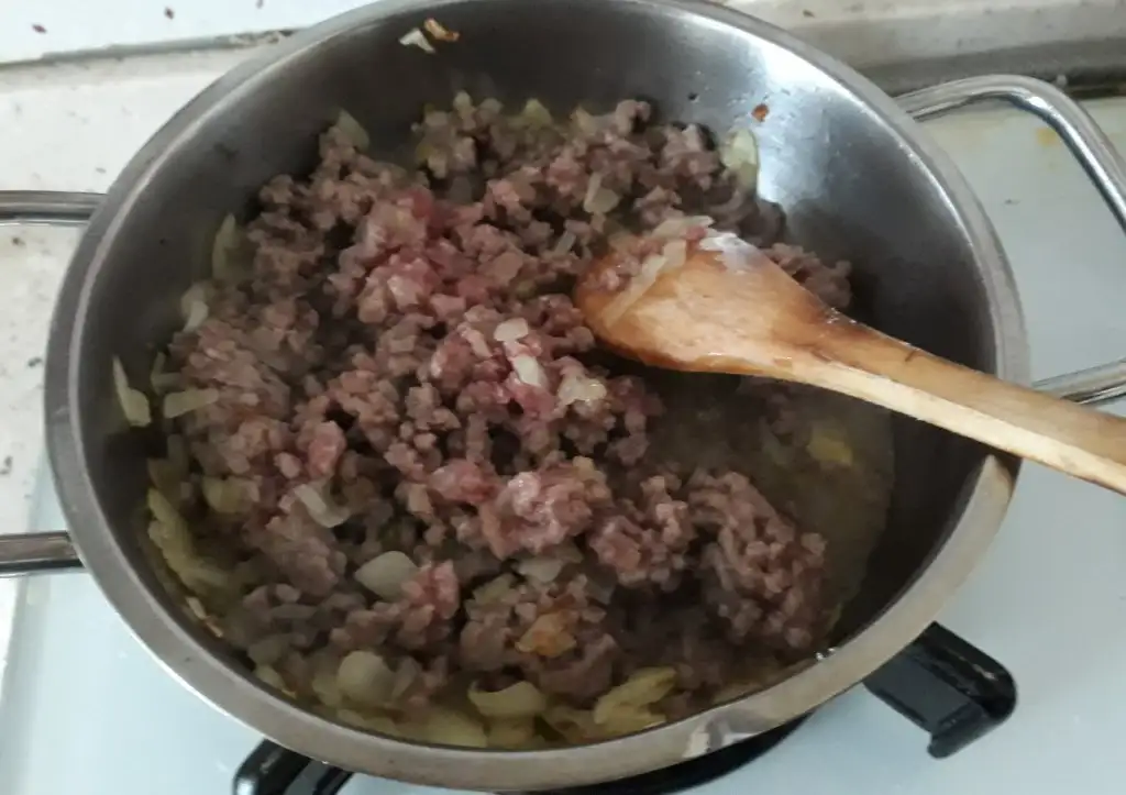 • Soğanlar hafif kavrulduktan sonra kıyma ve tuz eklenir.