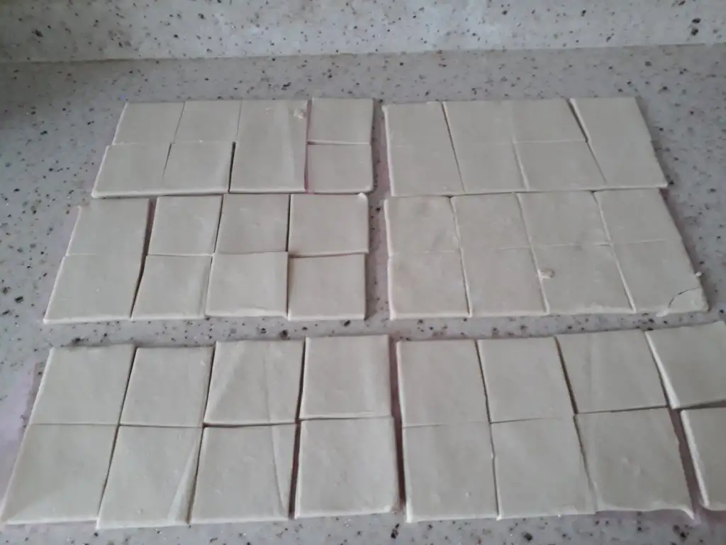 • Soğan ve kıyma kavrulurken milföy hamurları 8'e kesilir.