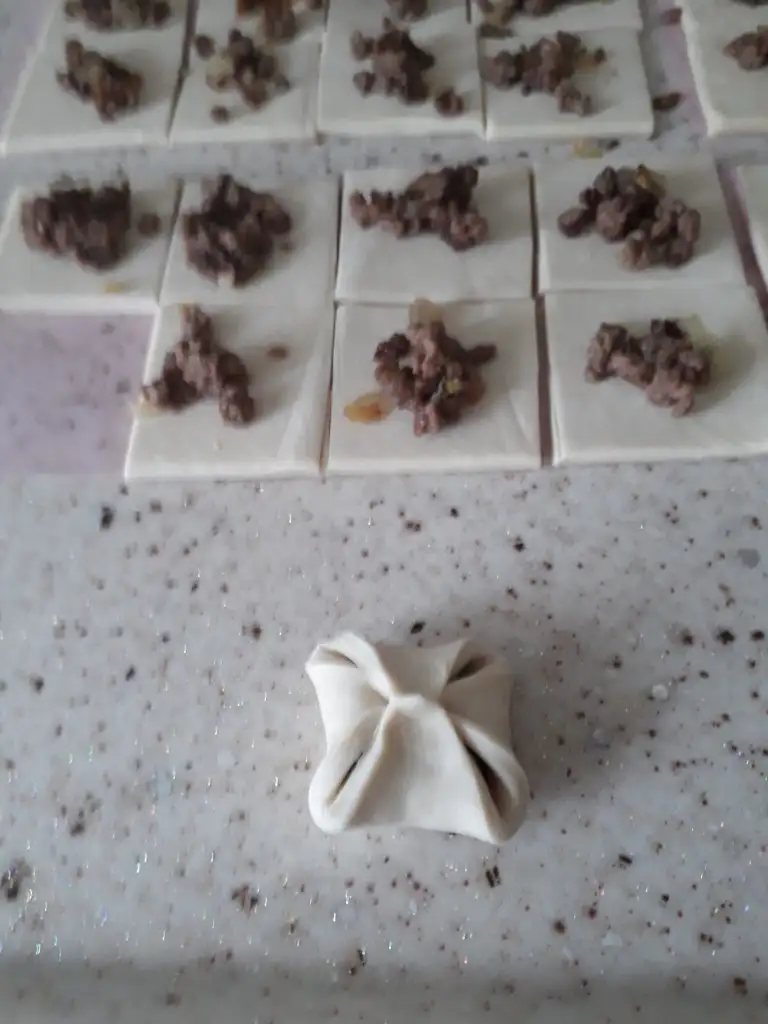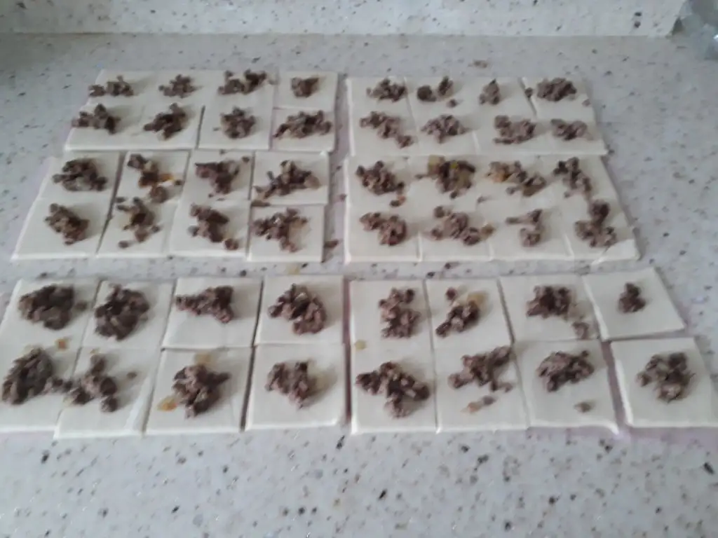• Milföy hamurlarının ortasına kıymalı harç konulur.