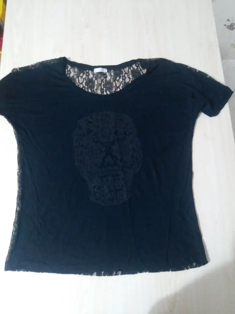 Ön kısmında boncuklarla kuru kafa işlenmiş S bedene salaş M bedene tam olur.. 5 TL