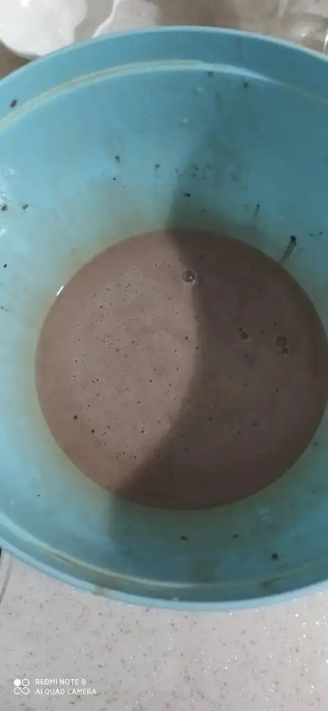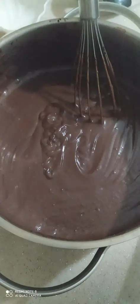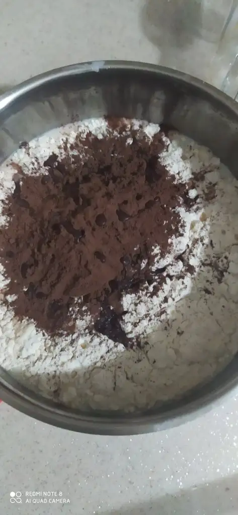 Elde edilen tereyağlı çikolatalı karışım, kakaolu karışıma ilave edilir ve güzelce karıştırılır.