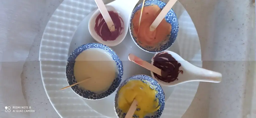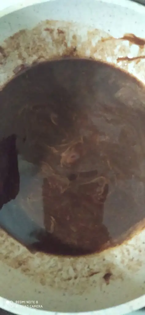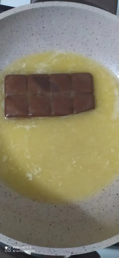 Eriyen tereyağının içerisine çikolata parçacıkları ilave edilir ve eriyinceye kadar karıştırılır.