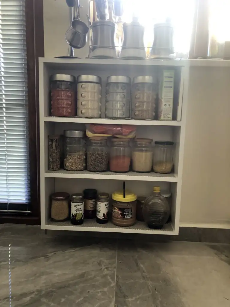 Hanımlar merhaba, fikrinize ihtiyacım var. Mutfağım çok ufak ve dolaplarım yetersiz olduğu için kavanozlarımı koyacak böyle bir raf yaptırmıştım. Şimdi bir bebeğim var artık emeklemeye ve yürümeye başlayacak inşallah. Genelde başka odalarda çok ıvır zıvır yok nispeten güvenli ama bu rafı ne yapsam bilmiyorum.