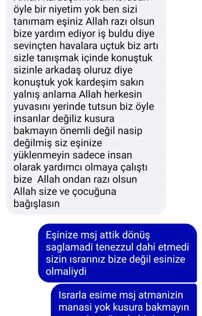 Kadin konuştukları diger ekran görüntülerinin hepsini atmis kadin israrla esime bulasikcilikta yaparim yeter ki is bul bu ulkeden gitmek istiyorum esimle de maddi yüzden ayrilik asamasina geldik yurt disina cikabilirsek yuvamiz kurtulur çok borc icindeyiz falan yazmis esimde sordum ama is yok demis kadin israrla bi gezip dolasip is ararmisiniz bize demis esim cevap vermemis sildim çünkü sen kızarsın diye korktum diyor çünkü cok kiskancim kadin dün tekrar is bulurmusun abi nolur demis yurt disinda yasayanlar grubu var oradan bulup yazmis esime de zaten biliyorum Türkiye bu kadar kötü hale geldi mi yaNormal hiçbir mesajı silme gereği duymazsın ama işin içine göt korkusu girdiyse normal olmayan şeyler vardır.İnterneti neden kaparsın mesajlar gelmesin diye.İş farklı yere gidecekmişte yakalanmış .Sık yularını burnundan getir ama niyeti olan yine yapacaktır.
