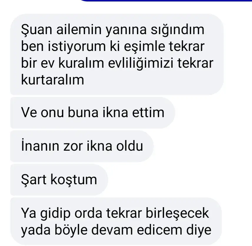 Kendi kafan gibi benimkini de çorba ettin.Yazdıklarından bişey anlamadım.Kizlar 10 15 gün önce bi kadin kocama faceden msj yazmis iste bulduğunuz ülkede is imkani varmi bizde yurt dışına yaşamayı düşünüyoruz diye esim de esinin meslegini sormus is ayarlayabilecegini söyleyebileceğini söylemiş msjlari bende gordum esine vatsap dan yazdı eşim adam cv gönder diye dönüş bile yapmadı adam ben konu kapandı sanıyordum ta ki sabah msjlar silinmiş bir şekilde kadinin. Attigi msjlarda bir tanesi yazılıp geri silinmiş bir msjda eşin Türkiye ye dönmek istiyor mu demis sonra tekrar musaait değilsin galiba yazmış tabi benim icimr kurt düştü bilmiyorum rahatsiz oldum madem birsey yok msjlar sildindi esimin pek msj silme adeti yoktur normalde birde sen li benli konusma gibi imalı imali müsait değilsin galibs yazmış kadın bilemedim ama esimle tartıştım niyr konusuyorsun yazmaya devam ediyorsun diye icimden esime karsi cok şeyler kopup gitti kadin israrla yazdı cocuklarimin hayatu kurtulsun istiyorum demiş bana oradan is ayarlayamazmisin demiş bu defa da bla bla öyle söylüyor esim midem fena bulandi bilmiyorum sinekte küçüktür mide bulandırır ya o hesap artik sağ gözüm sol gözüme sol gözüm sag gözüme güvenmez bu devirde o noktadayım daha öncede hamileyken eski sevgilisine istek atmıştı yazisma olmamisti ama bilmiyorum iste kafam corba oldu sizce bu aldatmaya teşebbüs mü