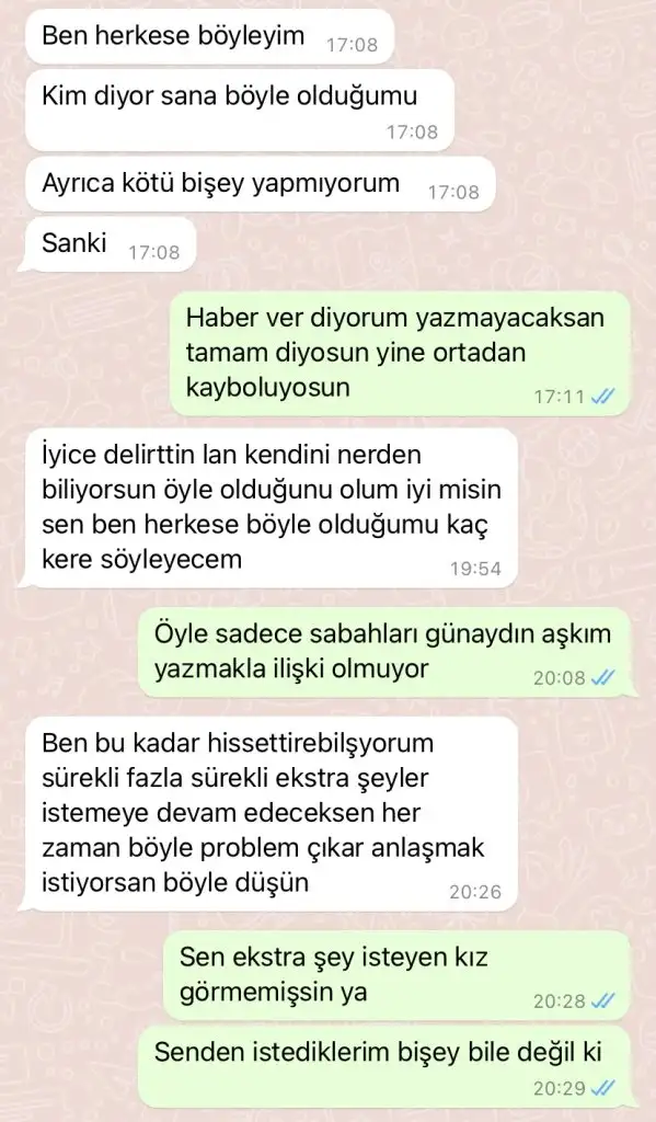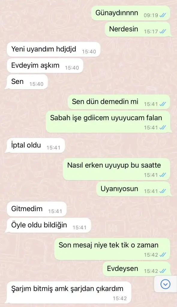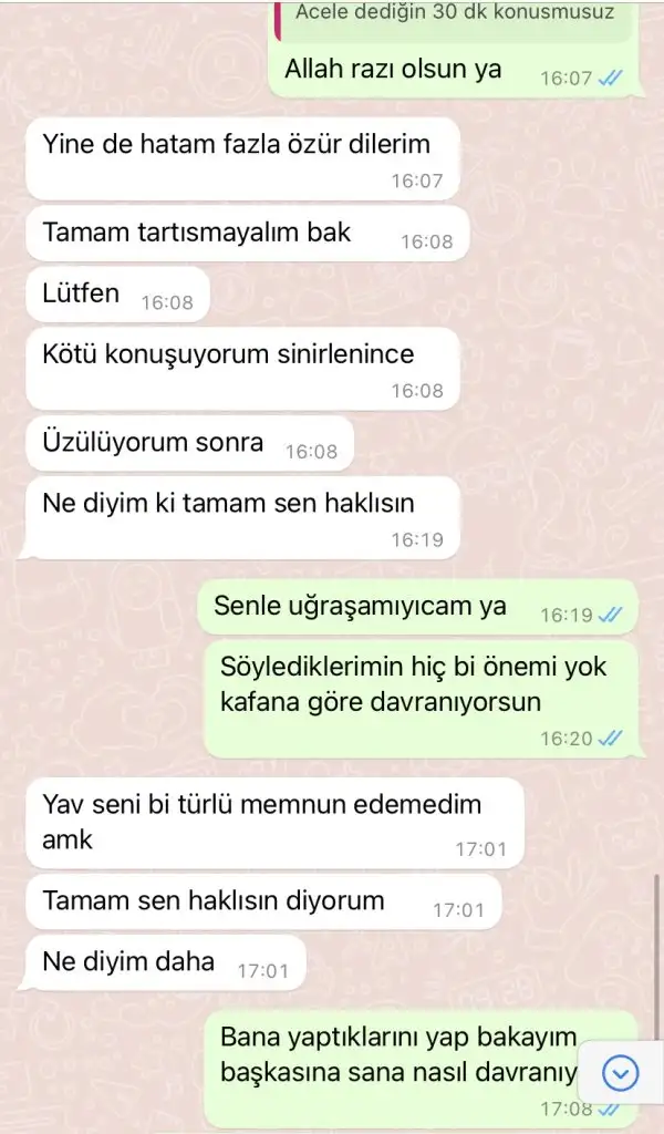 Olay şu gece saat 11-12 gibi konuştuk yarım saat. Sonra dediki işe gidicem uyuycam kapatalım. Sabah günaydın mesajı atıyorum öğlen 4 de yazıyor işe gitmedim. Bana aceleyle telefonu kapattırıyor ama. Güvenemiyorum yaniValla kim haklı olay ne anlamamız zor ama çocuğun küfürlü konuşması aşırı itici