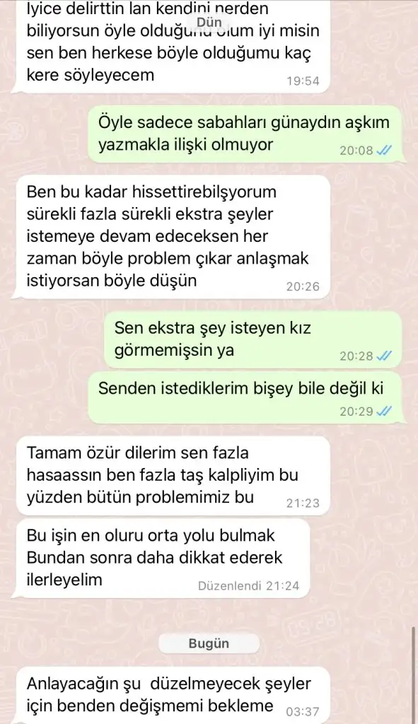 İnan o dediğini de çok yaptım. Saatler sonra çok yazdığım oldu ama onun pekte umrunda değil. Gece de en son işte o mesajı atmış ben de görüldü yaptım. Ayrılık mesajı atsam bile onu da umursar mı sanmamSen niye onun mesajlarina hemen cevap veriyosun ya . Adam kafasına göre kaç saat sonra cevaplıyor sen dakikasında yasiyosun. Okurken benim sinirlerim bozuldu düzelmez bu zaten hiç umurunda gibi de değil