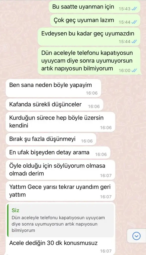 Mesaj atıp bitireyim mi yaniHayatım böyle birini adam etmeye çalıştığın ve kendini böyle kastığın için diyorum. Niye uyumadın niye yazmadın, yok tek tik oldu yok bilmem ne.. başka işin mi yok sal gitsin..