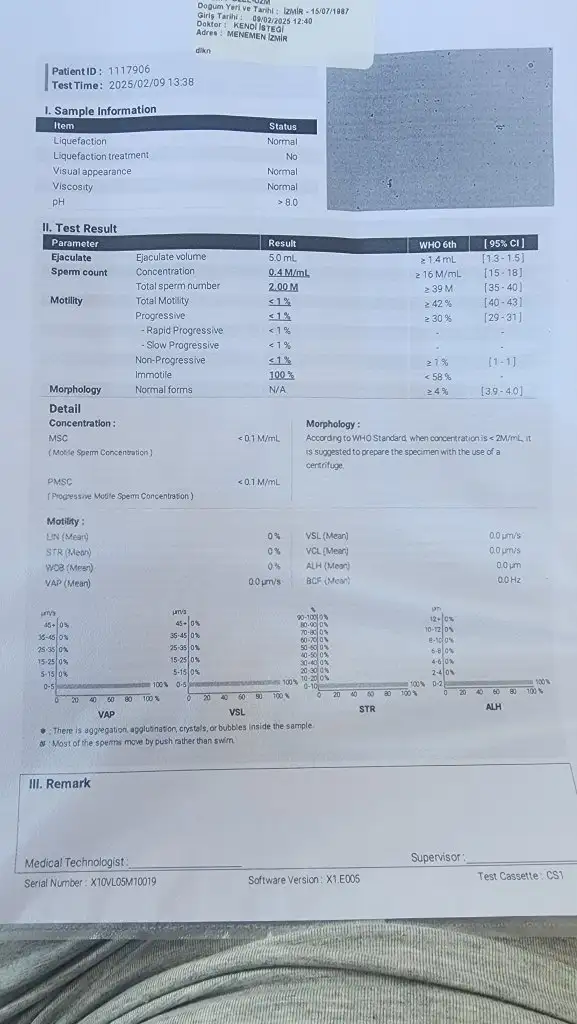 Merhabalar, biz 6 aylık evliyiz. Yaşımız gereği hemen çocuk istemiştik öncesinde ikimiz de kontrole gittik. Eşimde ilk başta varikosel demişlerdi.bugun sperm testimiz çıktı çok anlamadım fakat oldukça kötü gibi düşünüyorum. Tüm sonuclar 0 sanki. Tüp bebek muhabbetine çok uzağız. Bu değerlerle tüp bebek yapmak mümkün müdür? Hormon testleri normal cikti