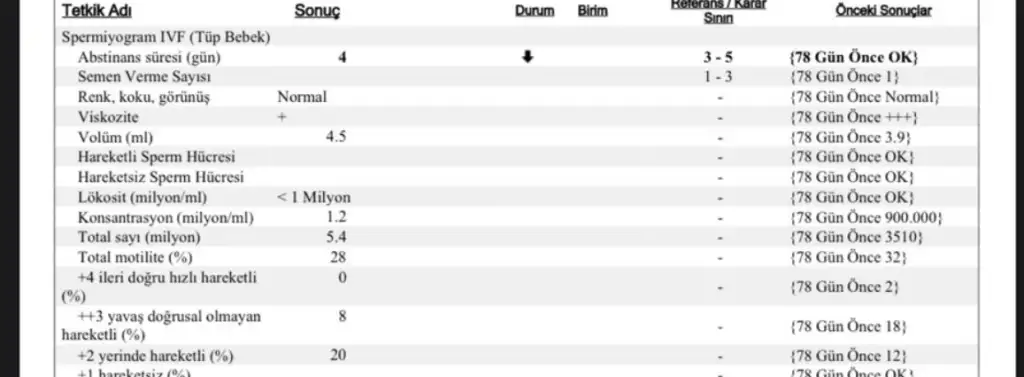 7 aydır antioksidan tedavisi gördük, benim de korkum o çok tedirginim. 1 tane sağlıklı sperm lazım deniliyor ama bakın görün ki döllenme bile olmamış sizde de..Değerler oldukça düşük ama tüp bebek için yeterli ileri hareketli sperm sayısı görünmüyor bu arada ama 5 10 tane bile olsa tüp bebek için yeterli. Size tavsiyem muhakkak 3 ay takviye kullanın düzenli beslenin sonra tüp bebeğe başlayın. Eşimin de sperm testi benzerdi hatta ileri hareket daha iyiydi yüzde 40 larda. Ama tüp bebekte döllenme bile olmadı. Ama sayı olarak doktorum oldukça yeterli dedi. Olur yani takılmayın sadece kaliteli olsunlar yeterli