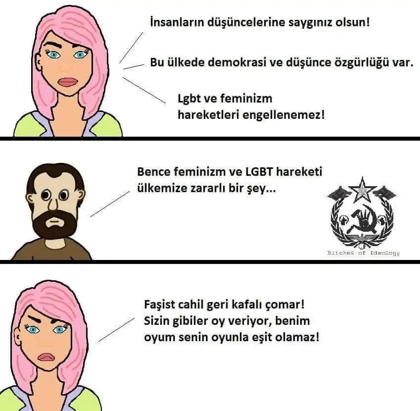 Böyle düşmanlık olmaz gerçekten komik oluyorsunuz. Kişilerin karakterleriyle oynamaktan vazgeçin, insanları birbirlerine doldurup, ayrıştırmayın. Zaten bir ayrışmadığımız nokta cinsiyetler kalmıştı, onu da siz yapmayın. Renkler ile ayrıştık, ırklar ile ayrıştık, diller ve dinler ile ayrıştık. Artık bu kin, nefret ve dizginleme huyunuzdan geri durun. Saygılar :)Aferin,işte kızlarımız bu erkekleri dışlayarak insanlar aleminde bir seçilim yaratacaklar. Predator erkekler tükenecek ve zeki, kibar erkekler revaçta olacaktır.