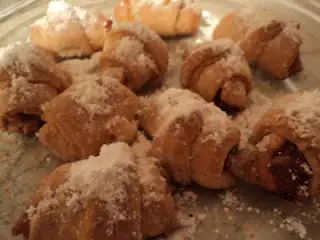 Hazırlanışı Harcı için;elmaları soyup rendeleyin.1 çay bardağı şekeri ekleyerek kısık ateşte pişirin.Soğuyunca dövülmüş ceviz ve tarçını ilave edin.Oda sıcaklığındaki yağı ve pudra şekerini bir kapta karıştırın. Üzerine yoğurt, kabartma tozu, vanilya ve unu ilave ederek yumuşak kıvamda bir hamur yapın.Sonra hamuru merdane yardımıyla açıp bardak ile keserek yuvarlak hamurlar elde edin.Yapmış olduğumuz harcı yuvarlak hamurların ortasına koyarak ay şekli verin isterseniz hamuru büyük bir daire(yaklaşık 20cm çapında) şeklinde açarak pizza dilimi şeklinde kesin ve harcı geniş olan kısma koyarak rulo yapın.180 dereceli fırında 30 dakika pembeleşene kadar pişirin.Üzerine pudra şekeri dökerek servis yapın.Afiyet olsun.