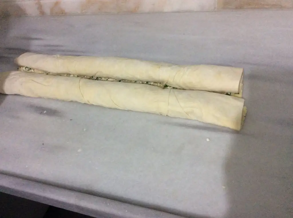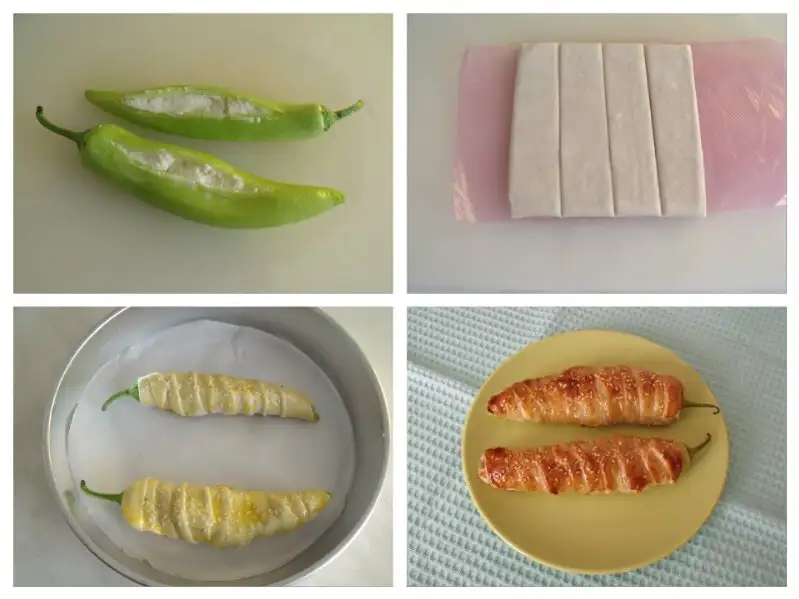 Milföy hamurlarını yumuşaması için tezgaha serin.Yıkanıp kurulanmış biberleri uzunlamasına kesin.İster kıymalı iç, isterseniz peynirli içle biberlerin içlerini doldurun.Milföy hamurlarını 2 cm"lik uzun çubuklar şeklinde kesin.