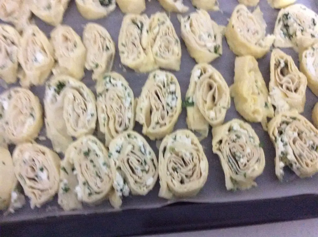 Biberlerin sap kısmi açıkta kalacak şekilde biberlere sarın.Şerit halinde istemezseniz kare olarak da kesip milföy'ü bütün halde de sarabilirsiniz biberlere. Biberler bitene kadar aynı işleme devam edin ve yağlı kağıt serili tepsiye dizin.