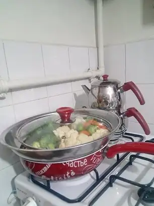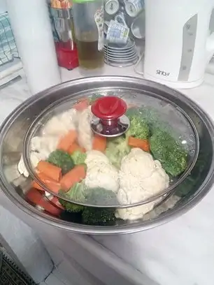 Tarife lüzum yok diye düşünüyorum çünkü başlıca malzemeler kevgire dizilmiş karnabahar,brokoli ve havuçtan ibarettir..ve altında da su dolu bir tencere mevcuttur...İyi seyirler diyerekten afiyet olsun dileklerimi kabul ediniz...