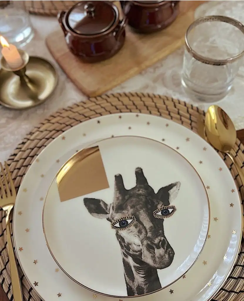 Dediğim olay bu. O yıldızlı servisin üzerinde hepsi güzel duruyor. Love yazılı, kalpli, zürafalı, egzotik serisi tabakları vs. Her biri ayrı serinin ama bir arada iyi duruyor. Ben olsam takımdan ziyade bu tarz birbiriyle kombinlenecek parçalar alırdım. Bunların dikdörtgen tabakları falan da var. 😁