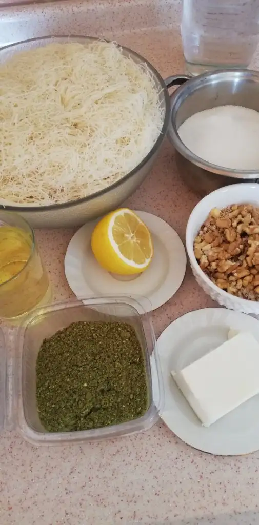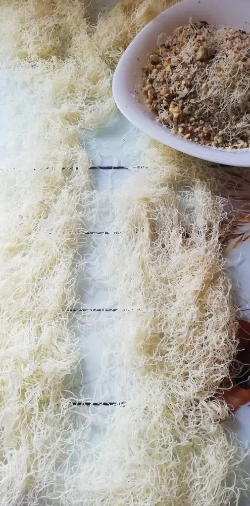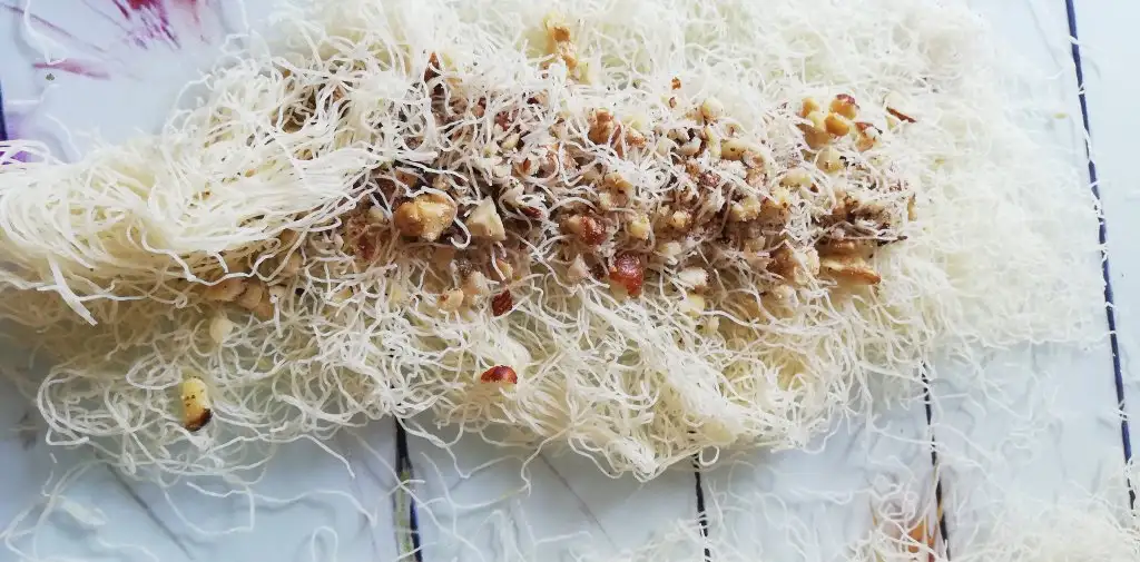 -1 su bardağı kadar kadayıfı da bayağı ufaltıp cevizi izi ekleyip iç malzemeyi hazırlıyoruz..