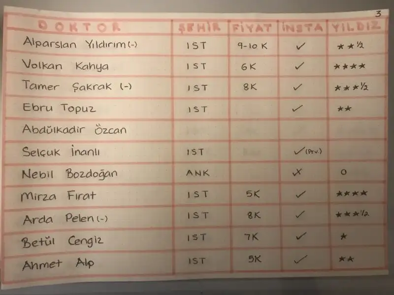 Burun estetigi konusunda ismi en cok anilan doktorlari arastirip, bulup, bu doktorlarin sosyal medya hesaplari ve kendi websitelerini incelemem dogrultusunda kendime refereans olmasi icin doktorlarin isimlerini, bulunduklari sehirleri, fiyat bilgilerini, Instagram hesabi olup olmadigini ve kendi kisisel takdirime dayanarak "yildiz" bazli puanlamalarimdan olusan bir tablo hazirladim. Bu tablolari da fotograf seklinde buraya ekliyorum.