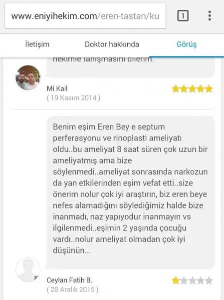 haklısınız ama benim gerçekci bulmadığım taraf 8 saatlik bir ameliyat olduğunu onlara söylenmemesi, ve eşi nefes alamayınca doktorun naz yaptığını söylemesiDediginiz yorum bu sanirim. Gerçekten öldü mü yoksa karalama kampanyasi mi bilmiyorum ama narkozdan ölen insanlarin oldugu bi gercek ne yazikki. 8 saat cok uzun bir süre oldugu icin hic belli olmaz ne olacagi. İnsallah gercek degildir. Ayrica dava acsaniz bile kazanamazsiniz. Cunku ameliyata girmeden once kagit imzalatiyorlar her turlu sorumluluk hastada oluyor. Devlet yada ozel fark etmez uygulama boyle. Dediginiz gibi dikkatli secmek lazim doktor secerken.