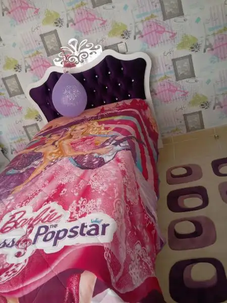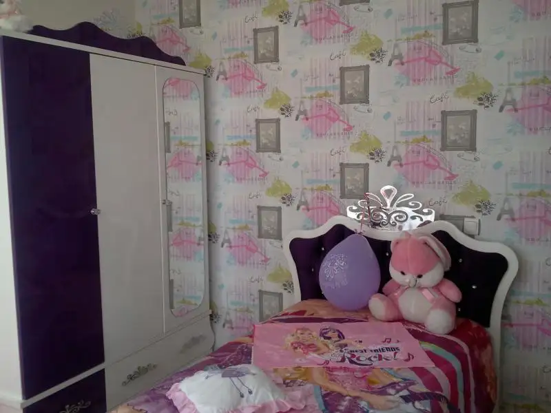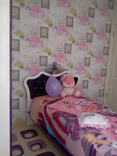 bence duvar kağıdı pastel renklerde kendinden desenli yatak örtüsü de düz renk olmalıydı, ama belki de kendi istemiştir. bunlar değişebilecek şeyler, mobilyanızı beğendim, güle güle uyusun