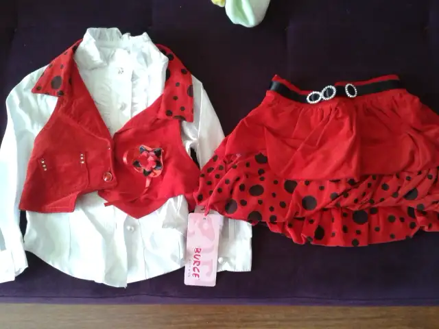 1 yaş takım. hiç giyilmedi. kadife etek ve yelek, beyaz gömlekten oluşuyor. 12 tl.