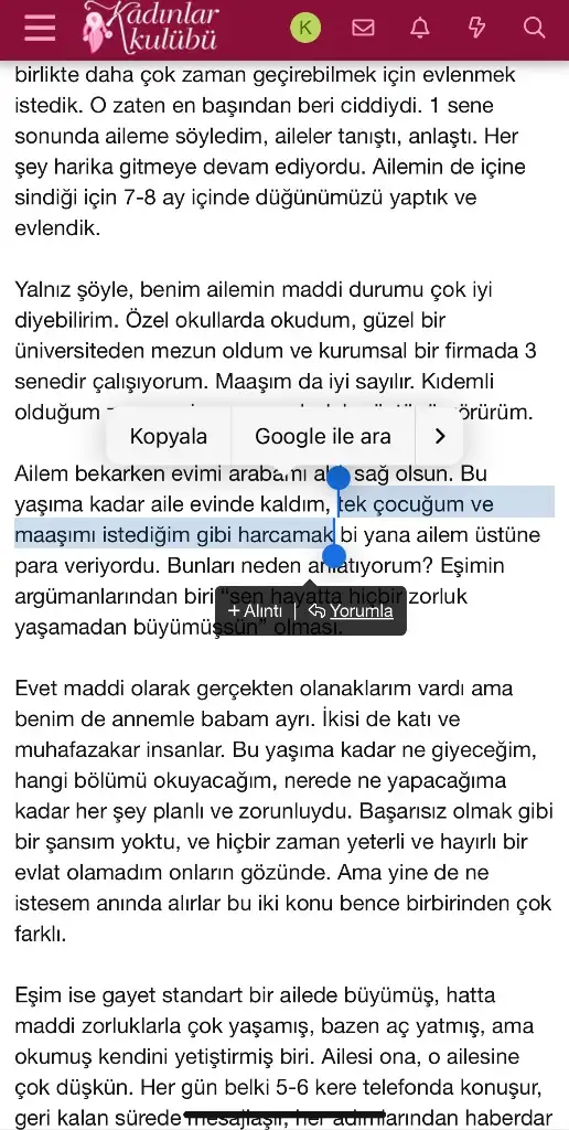 Adamın gezme anlayışı boş şekilde avm gezmek ve ailesine gitmek. Yürüyüş yapmak. Yani mesela canım bir kahve çekiyor onu söylemeye çekiniyorum. Ben alırsam bir şey demiyor ama. Gelip içiyor hatta kahvedenama mesela gel bir kahve içelim sana üst baş alalım falan demiyor. Kahve içsek desem dışarda masraf yapmayalım diyor. Dışarda yemek yemeyelim diye ailesinde yemek istiyor. Kendi oturuyor ben bulaşık yıkıyorum.