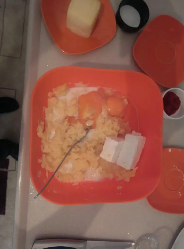 Patateslerimizi haşlıyoruz ve haşlanan patateslerin içine beyaz peyniri de ekleyip eziyoruz(yada rendeliyoruz) sonra sıvı yağ , iki yumurta ve sütümüzüde ekleyip karıştırıyoruz.