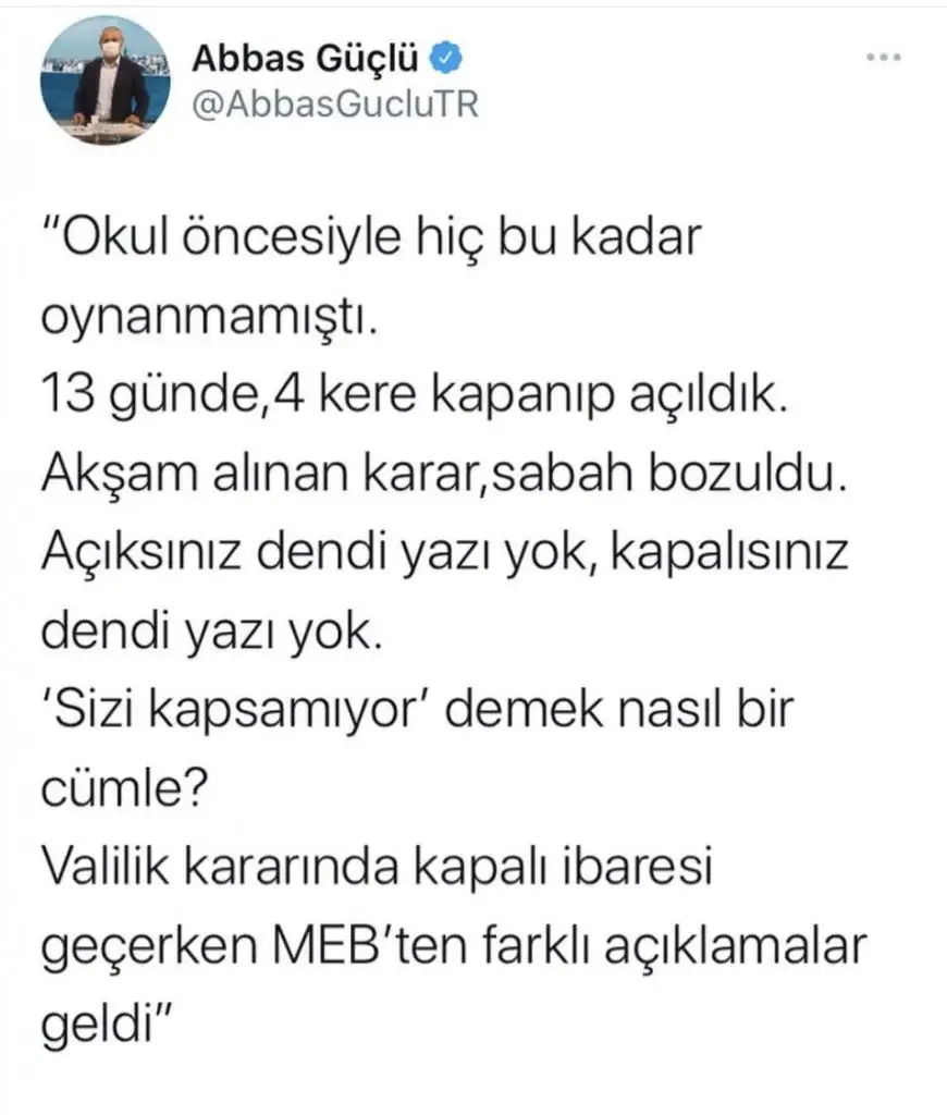 Pandemide calismak istemiyoruzu ben anlamiyorum acikcasi, diger ogretmenler kendileri icin degil daha cok ogrenciler bulastirmasin diye online egitim veriyorlar....evet anaokullarinn acilmasi bulas acisindam cok pantikli degil ama ogretmenlerin bizim canimiz yok mu soylemi cok itici, ulkenin %90 i calisiyor onlarin cani can degil mi ?Ogretmenler tarafindan bakinca onlar biz de diger ogretmenler gibi pandemide çalışmak istemiyoruz diyorlar, haklilar.. kac kere twitter da vs gündem oldu.