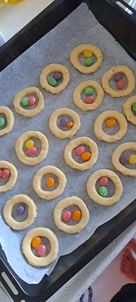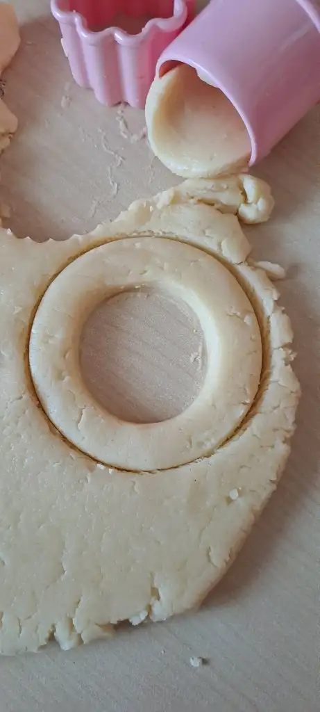 Önce çay bardağı sonra küçük kurabiye şekil kalibi kullanarak hamura halka şeklini veriyoruz.