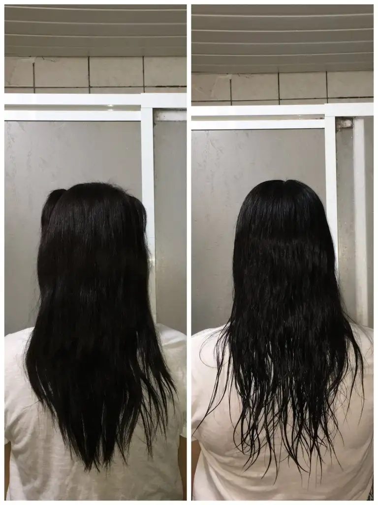 Bence sagdaki sac soldakine gore biraz islak. Bu sebeple ağırlıktan asagida duruyor. Hicbir sey mucizeci bir sekilde 1 haftada uzama saglamaz. Oyle olsaydi insanlar kozmetiklere deli paralar ödemezlerdi.