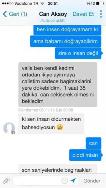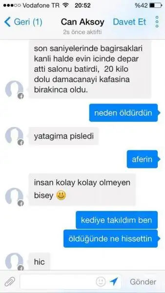 Ya bunun kızarkadaşı da mı varmış??? İyi ki kızı öldürmemiş sapık herif. O mesajları falan paylaşan kız arkadaşı mıymış.. Dünkü konuda paylaşmıştım. Görmeyenler için buraya da koyuyim.