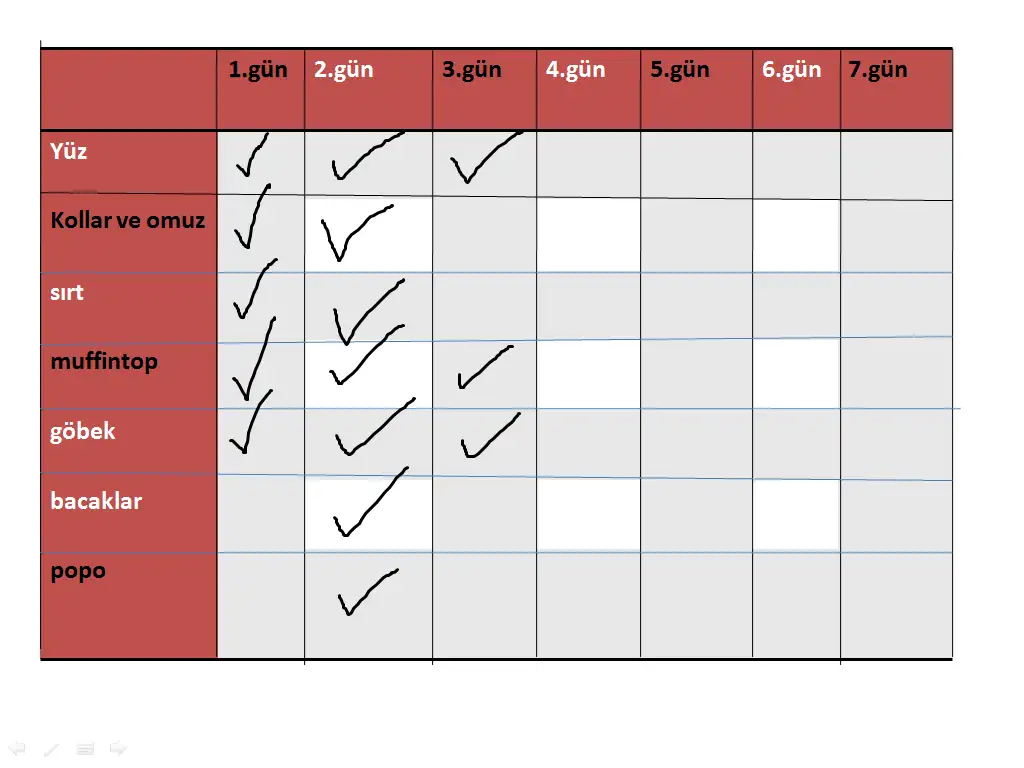 evet listemiz bu hergün ,her bölge çalışacak kızlarrrrr kaçış yok ,bayramda serdik belki kendimiz mesela ben çok boşladımmm hemen hemen toparlanmalıyızzzzzzz :oops: yarından itibaren sımsıkı çalışmaya başlıyoruzzzzz ,pes etmek yok :KK20: burda yüz yazıyor o ne iş derseniz yüz için de yoga yapıcam bir kadının kitabı var bende laurdes doplıto çabuktu sanırım adı onun içinde bir topic açıp çektiğim foto veyahut videolarını atacağımm bir aya taş gibi hatunlar olacağızzzzzzz sizleri seviyorum yoldaşlarım hep beraber yağları yakacağız