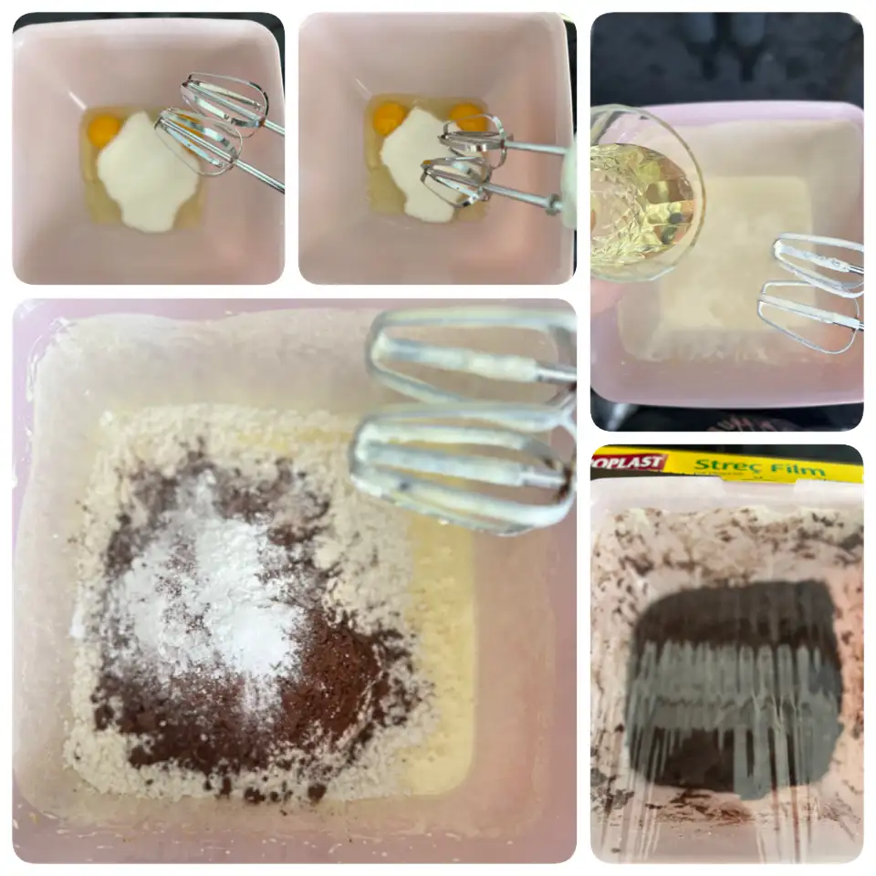 2 yumurta ve şekeri köpük köpük olana kadar çırpalım. Sıvıyağı ve diğer malzemeleri de ilave edip hafif ele yapışan bir hamur elde edelim.