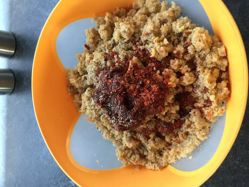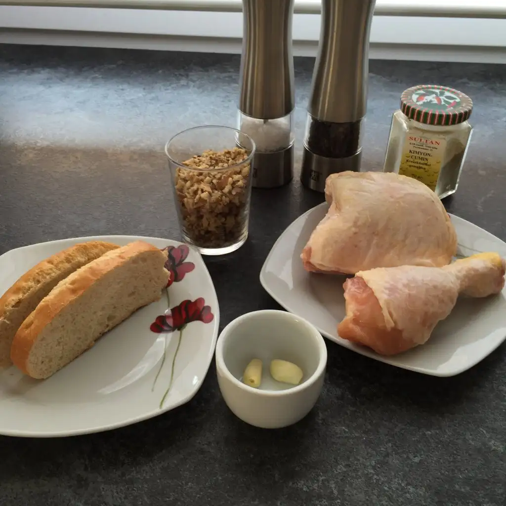 Ekmekler robotta cekılır uzerıne 1 su bardagı tavuk suyu dokulup az beklenır sonra cevız tavuklar ve baharatlar katılıp cok ezmeden bıraz cekılır Eki Görüntüle 1404901