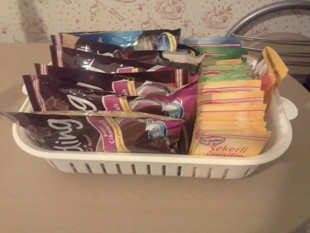 Bende seffaf kapakli bir kutuda sakliyorum butun pasta malzemelerimi..Bu arada ben kabartma tozu puding gibi şeyleri şöyle bir sepette saklıyorum yoksa cok dagılıyor.