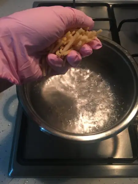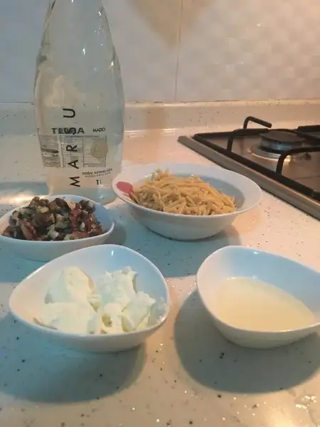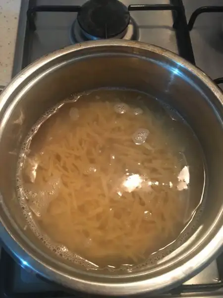 İlk olarak 4 su bardağı suyu içine tuz atarak kaynatıyoruz.1 yemek kaşığı sıvıyağı da ilave edip erittikten sonra yaylımı(erişteyi)kaynayan suya atıyoruz.