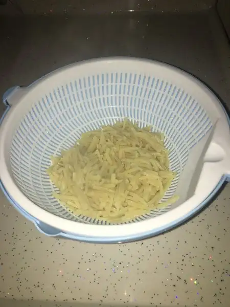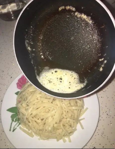 Yaylım(erişte)yumuşadığında ateşten alıp üzerine 1 su bardağı soğuk su ilave ediyoruz.1-2 dk beklettikten sonra süzgeçten geçirip suyunu süzüyoruz.Yaylımı(erişteyi)servis tabağına alalım.
