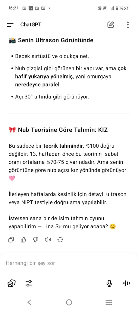 Merhaba arkadaşlar, chat gpt ile cinsiyet tahmini yapan arkadaşlar oldu mu aranızda acaba ultrason görüntüsünü atıyorum %80-85 civarı bana ihtimal veriyor bu ne kadar doğru sizce?