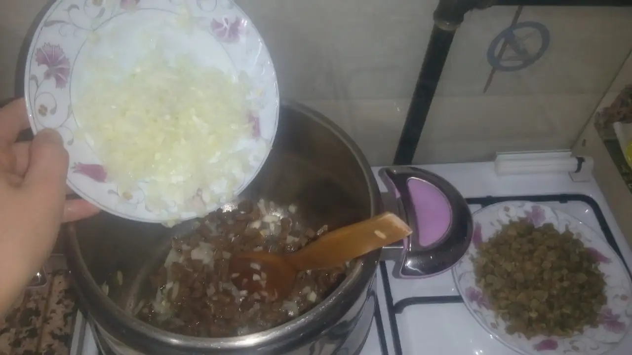 •Pişen etimize ince kıyılmış soğanları ilave edip kavuralım.
