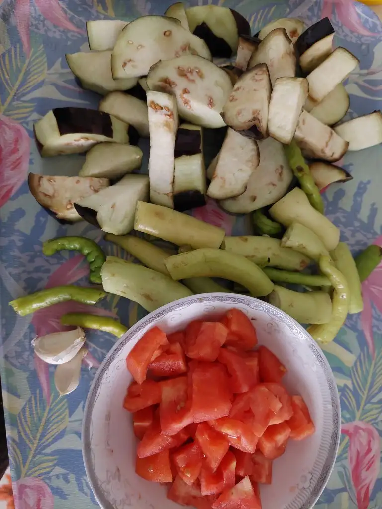 Patlicanlari kizartmak icin dogruyorum ..biberler ve patlicanlar ayiklanmis ve dogranmis olacak