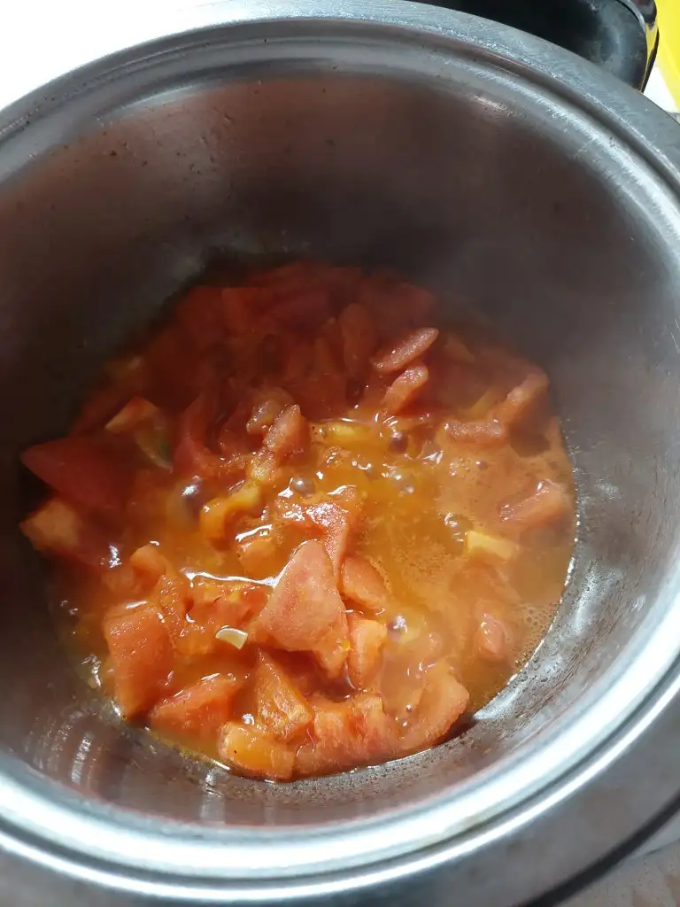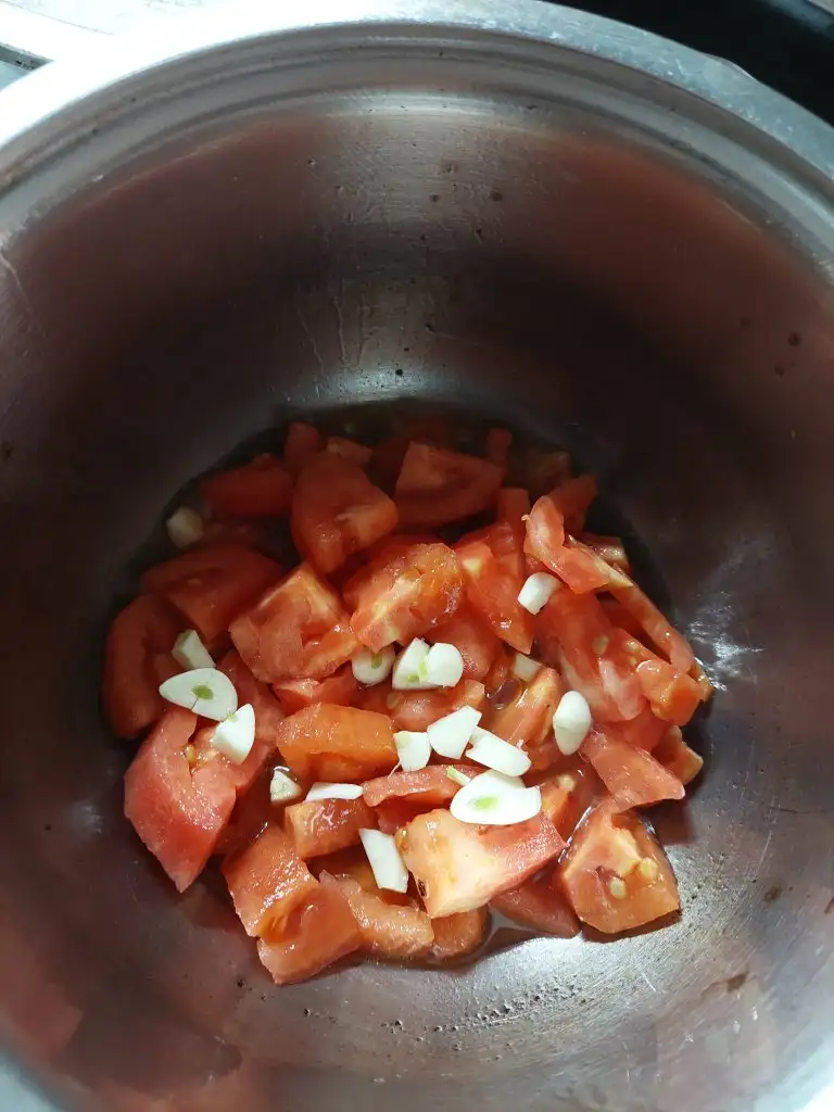 malzemeleri kizarttiktan sonra ocaktaki kizartma yagımı azaltip domates ve sarimsağı ekliyorum yağıma