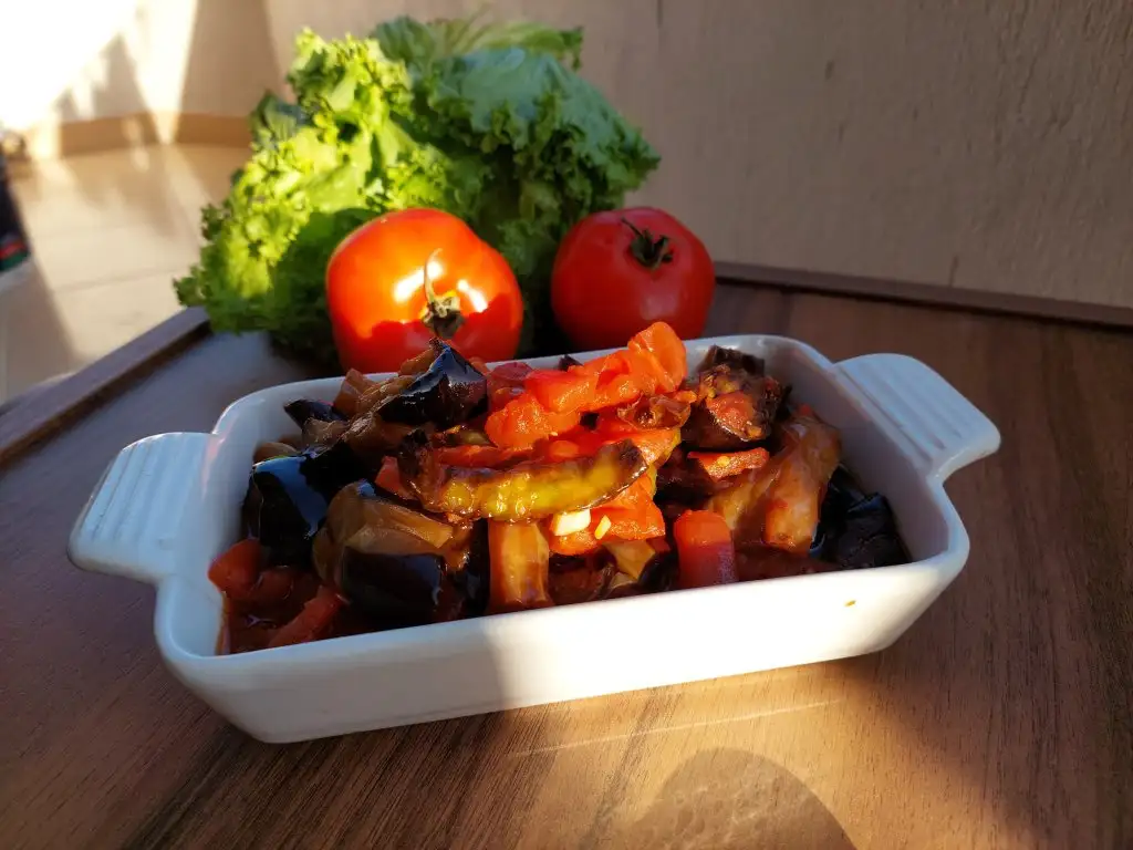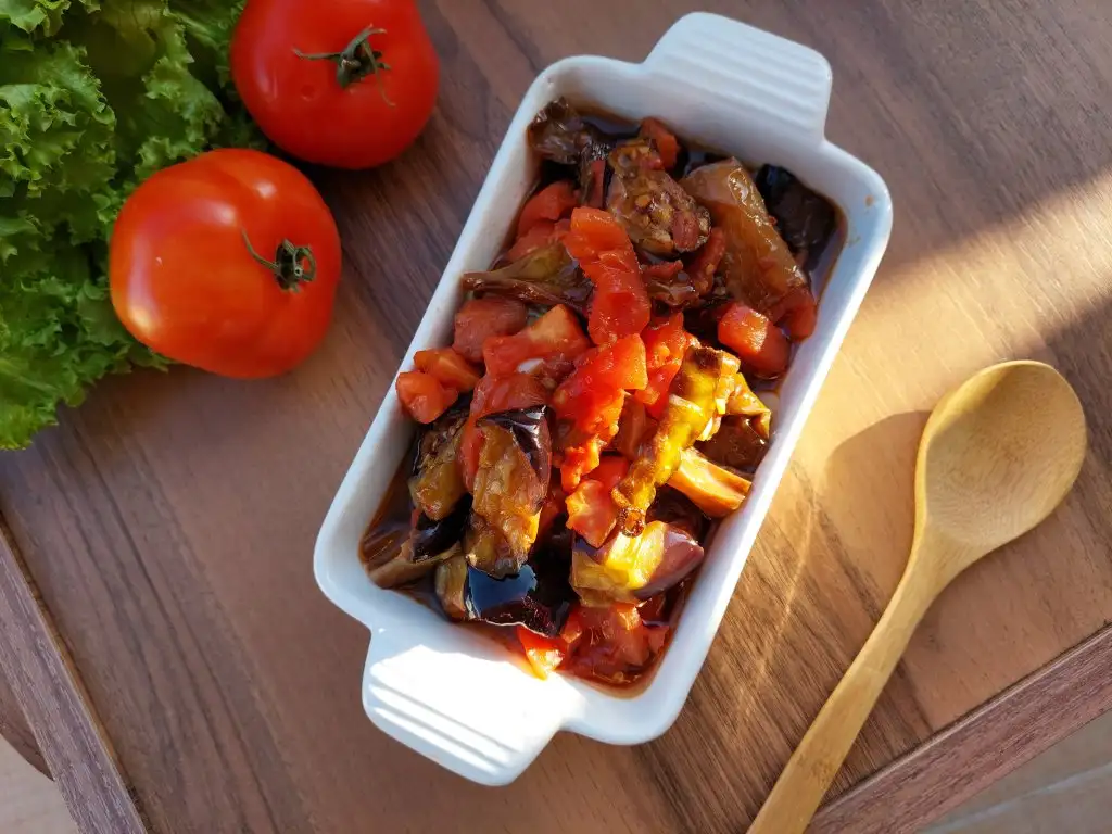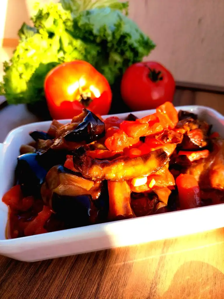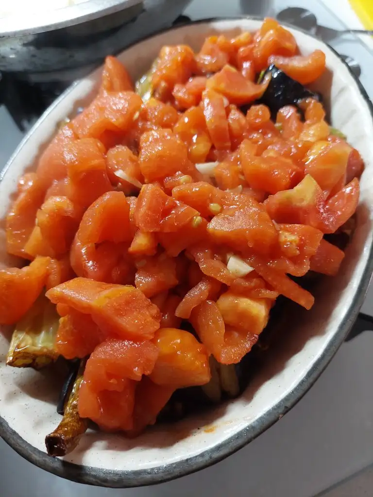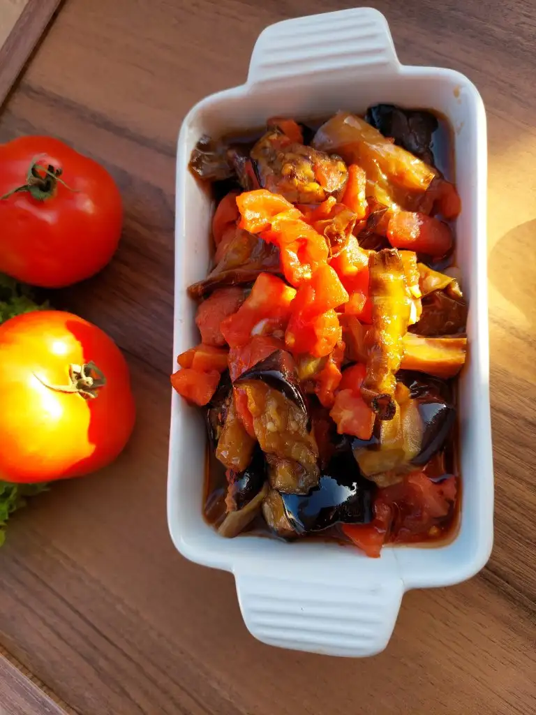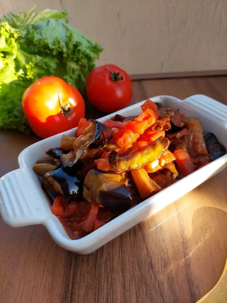 domatesler hafif sulandıgında kizaran patlican biberin uzerine alip biraz malzemlerin birbirine gecmesi icin ocakta 5 ila 10 dk arasi pisiriyorum