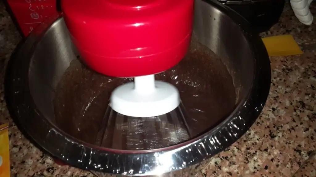 Tüm parçalarda aynı işlemleri yaptıktan sonra, üç dolu yemek kaşığı kremayı bir kaseye alıyoruz ve cıvık muhallebi kıvamı alana kadar çırpıyoruz .