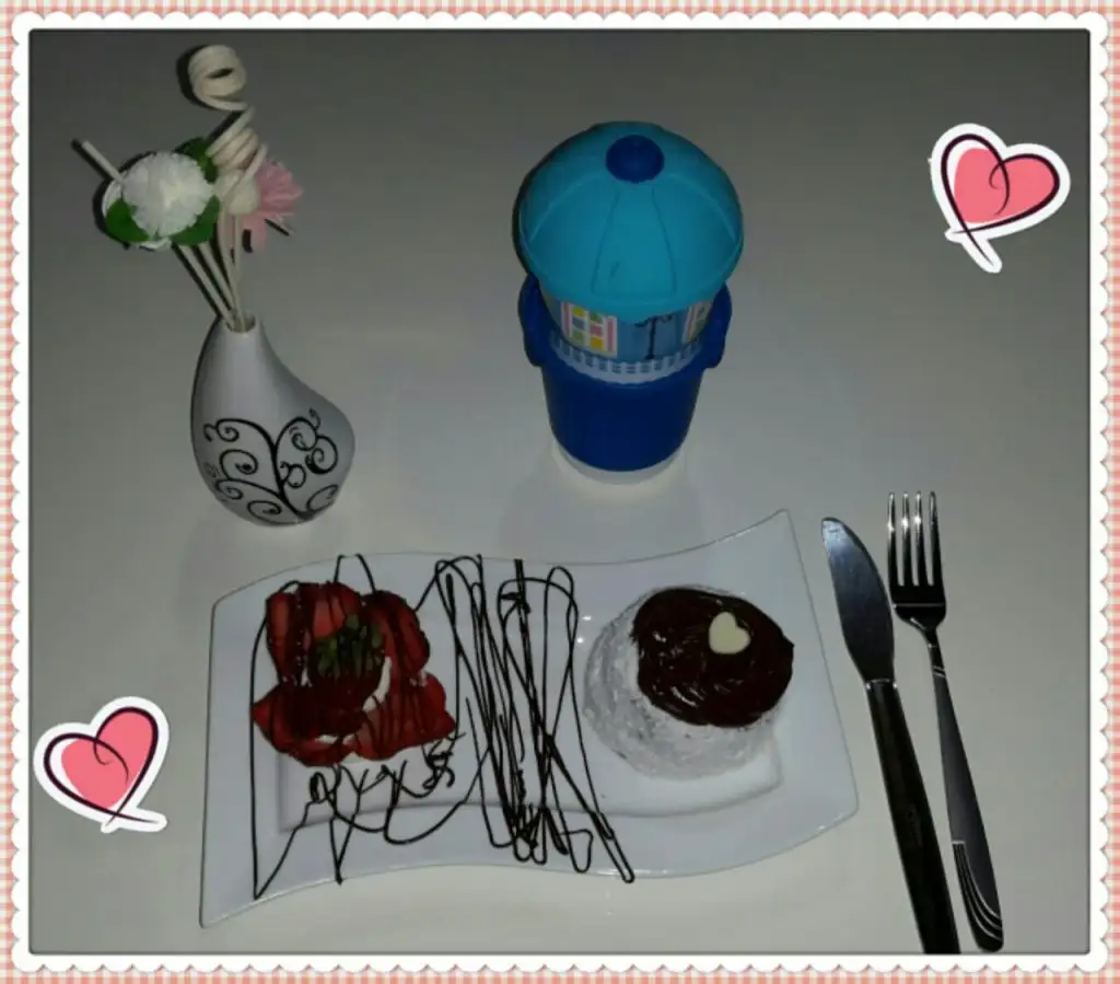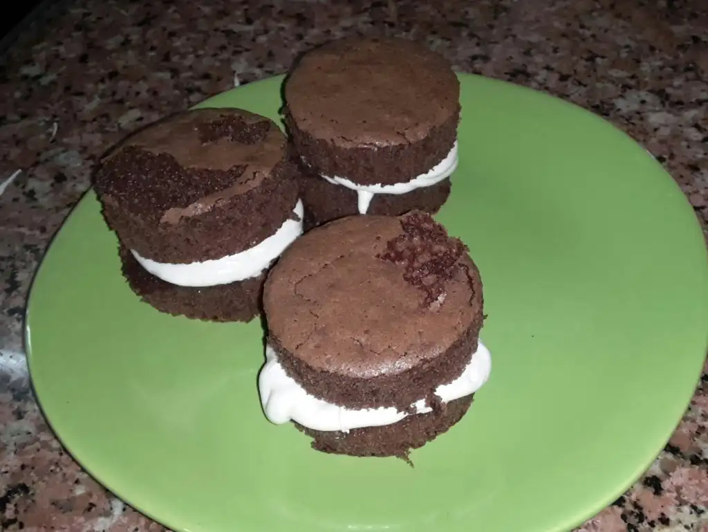 .Küçük pastaların açıkta kalan kısmını yine 1 yemek kaşığı sütle ıslatıyoruz. Tatli cikolata sosunu tarife gore hazirlayip Küçük pastaların üstünde boş kalan kısmina krema posetiyle sıkıyoruz.