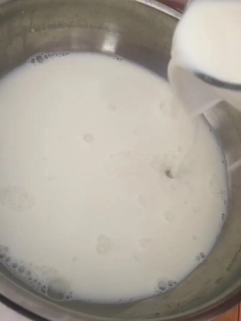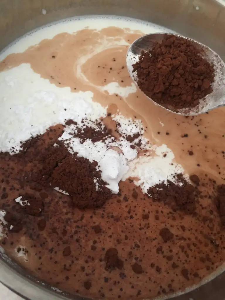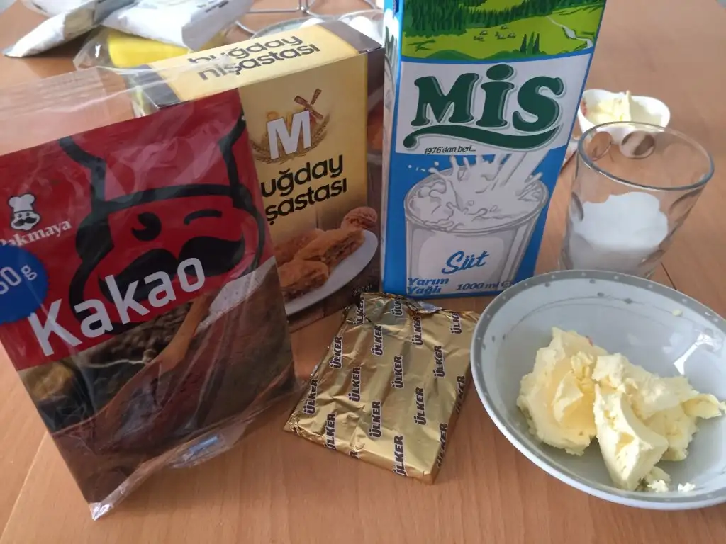 Pastanın kremasını hazırlamak için; derin bir sos tenceresinde 2,5 su bardağı sütü, yarım su bardağı toz şekeri, yarım su bardağı nişastayı ve 2 yemek kaşığı kakaoyu koyulaşana kadar sürekli karıştırarak pişirin