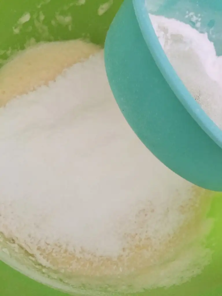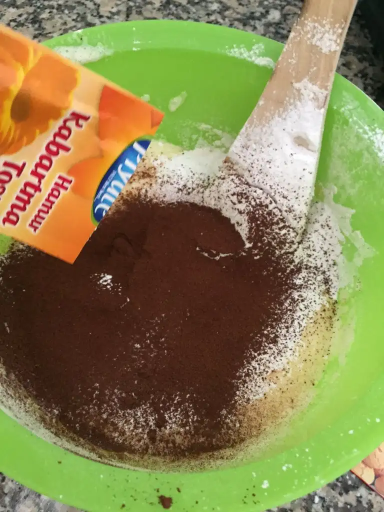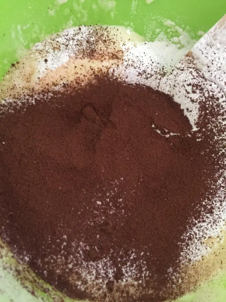 3 yemek kaşığı un, 3,5 yemek kaşığı nişasta, 2 yemek kaşığı kakao ve 1 paket kabartma tozunu yumurtalı karışıma eleyin.