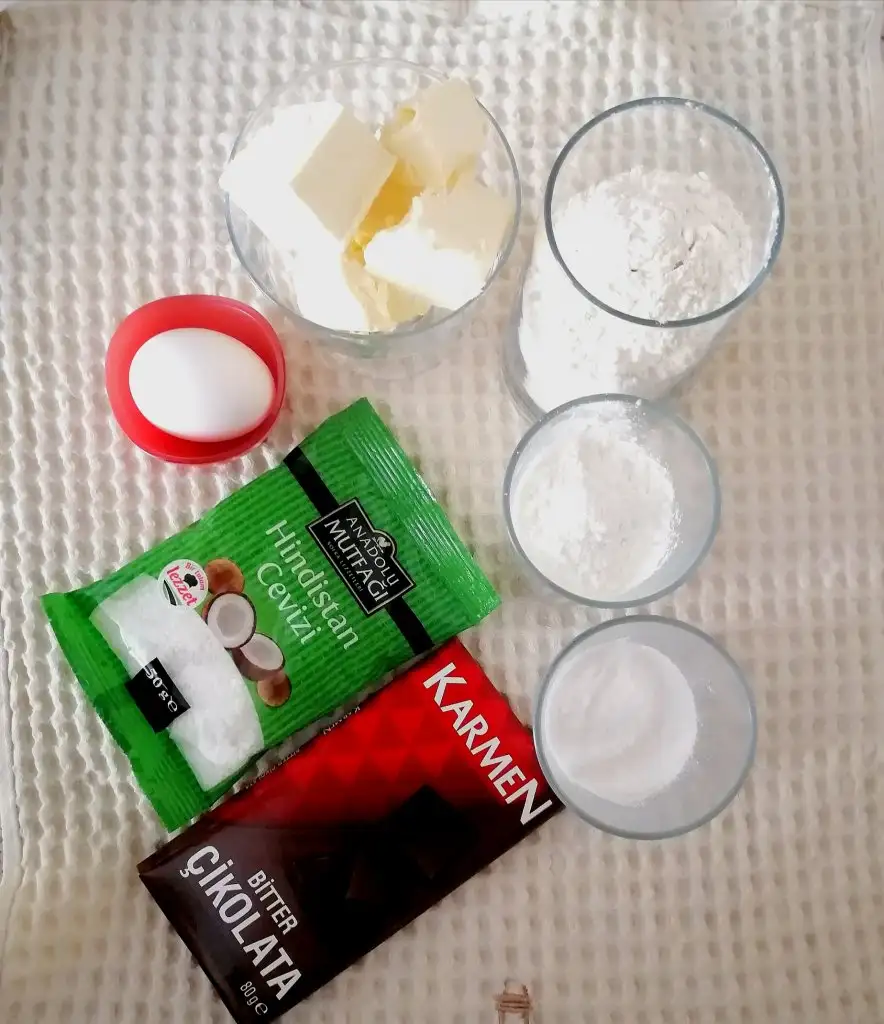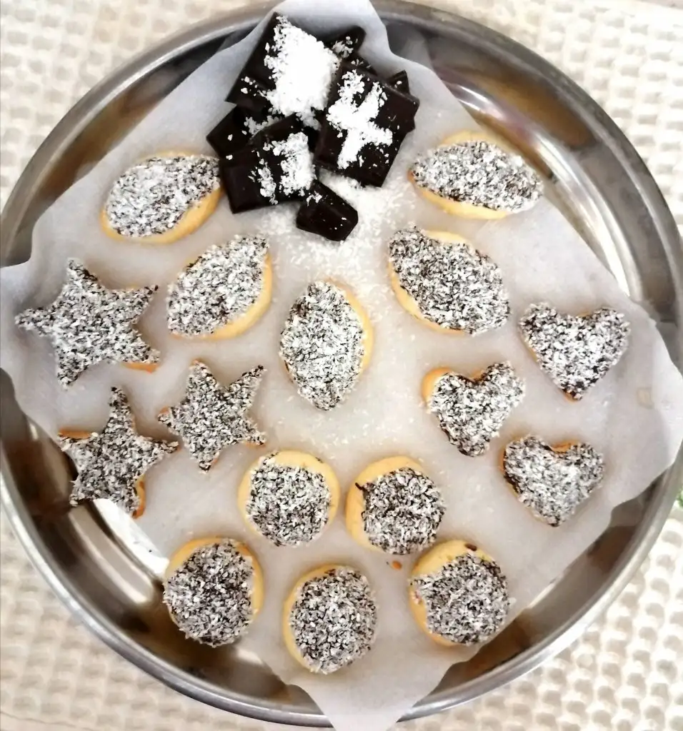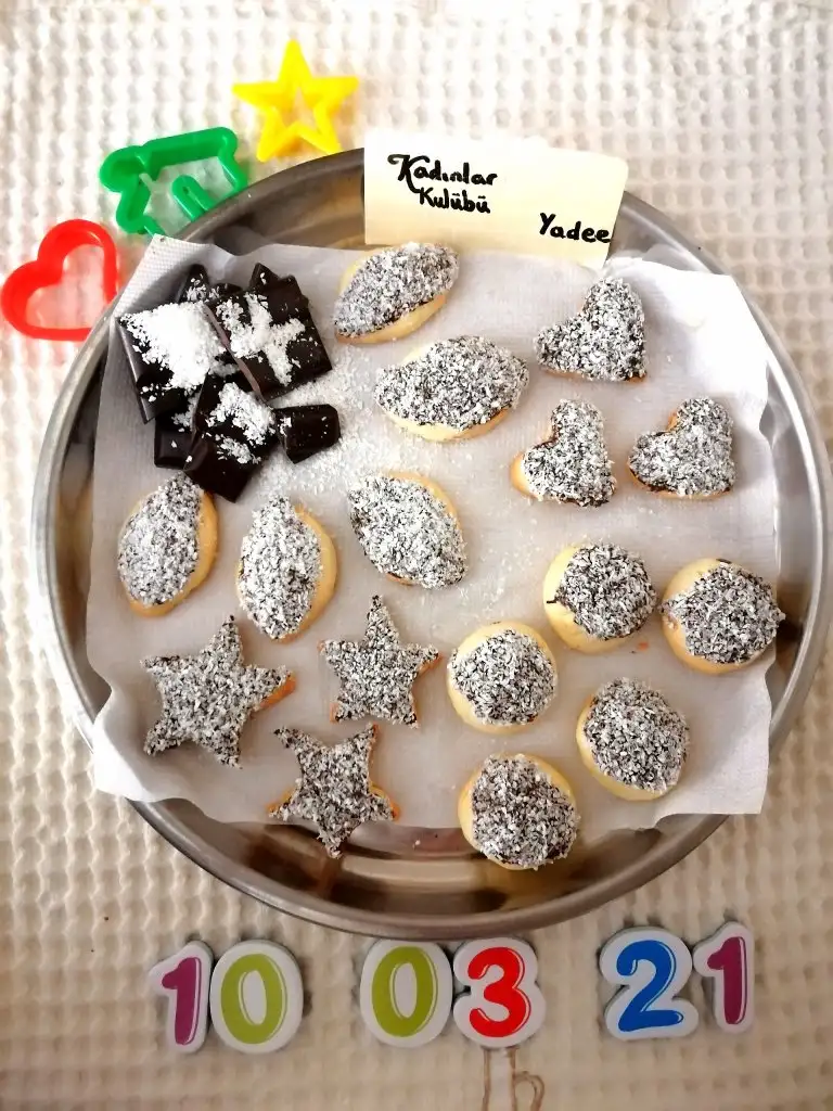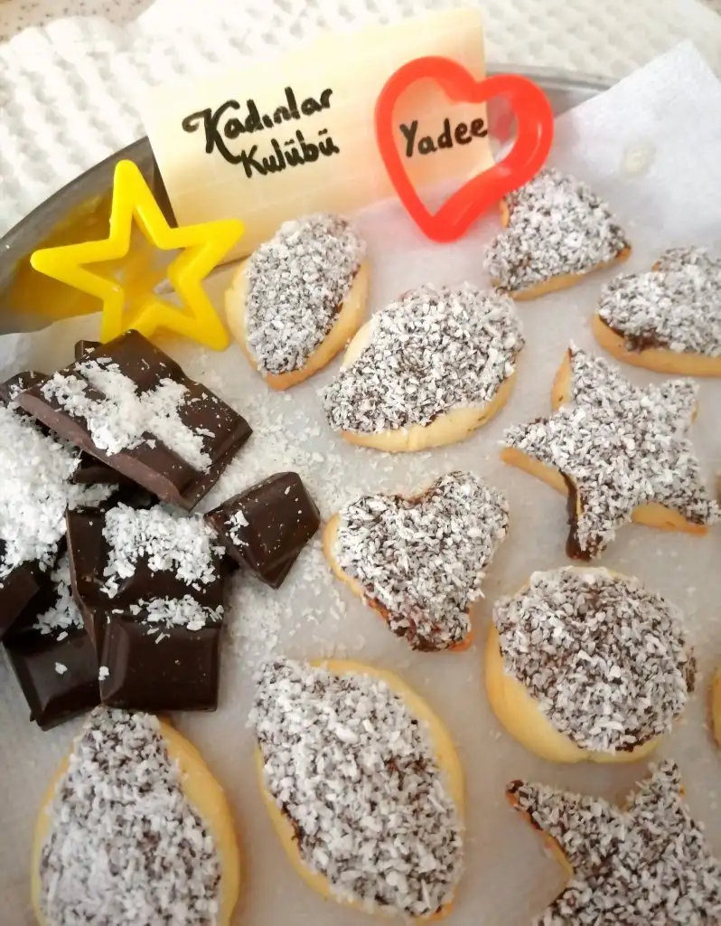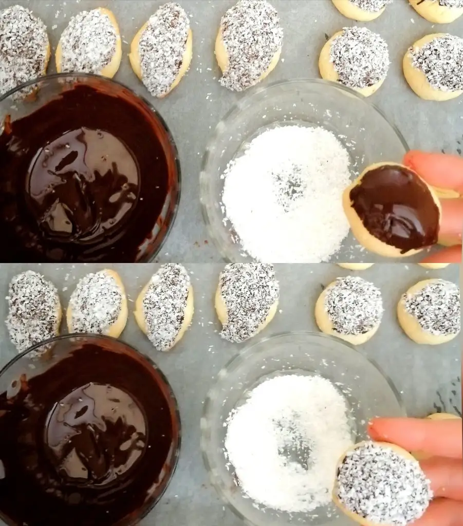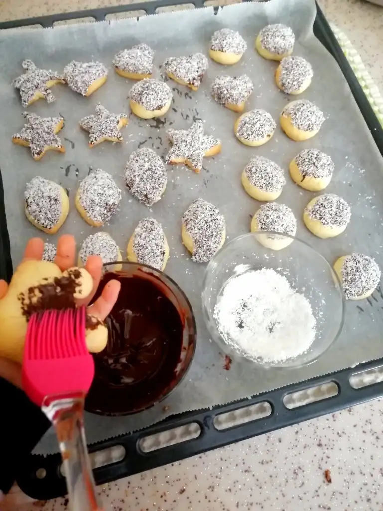 Kurabiyelerimiz tamamen soğuduktan sonra üst taraflarını önce çikolataya sonrada hindistan cevizine bulayalım.