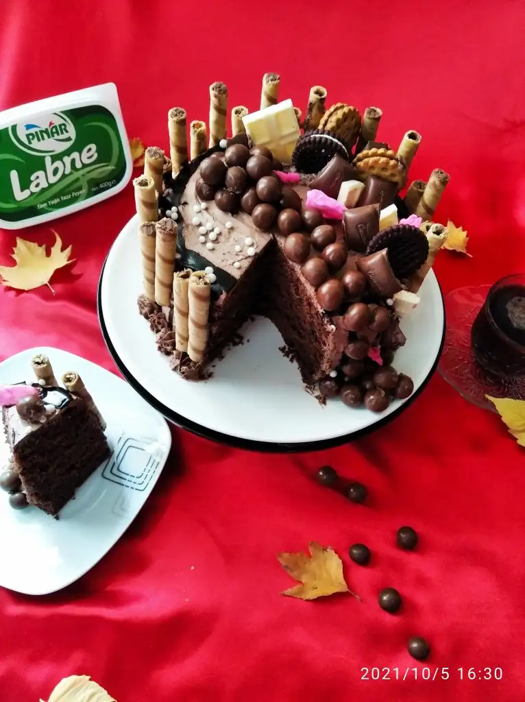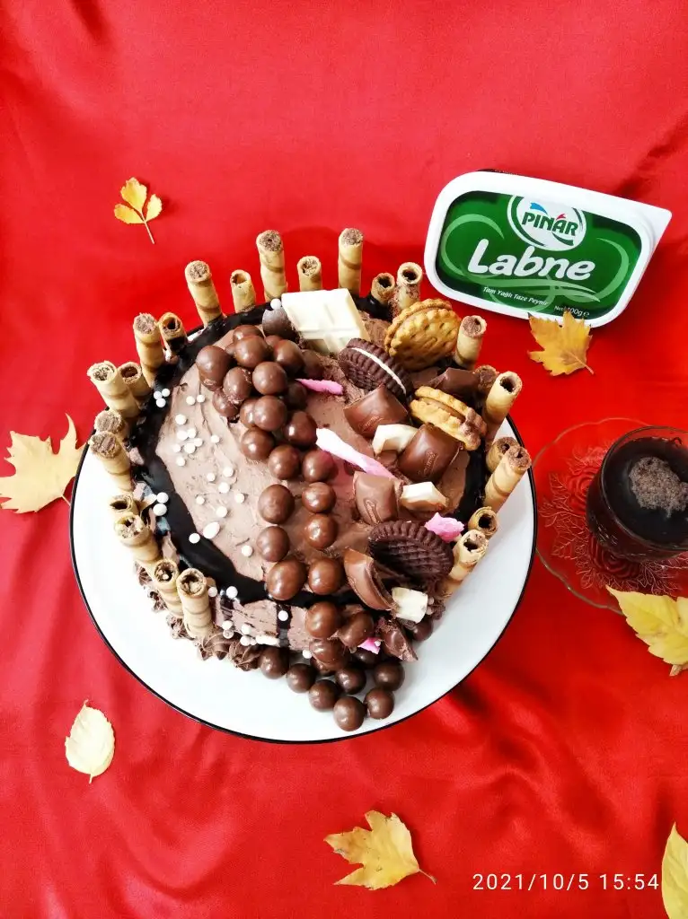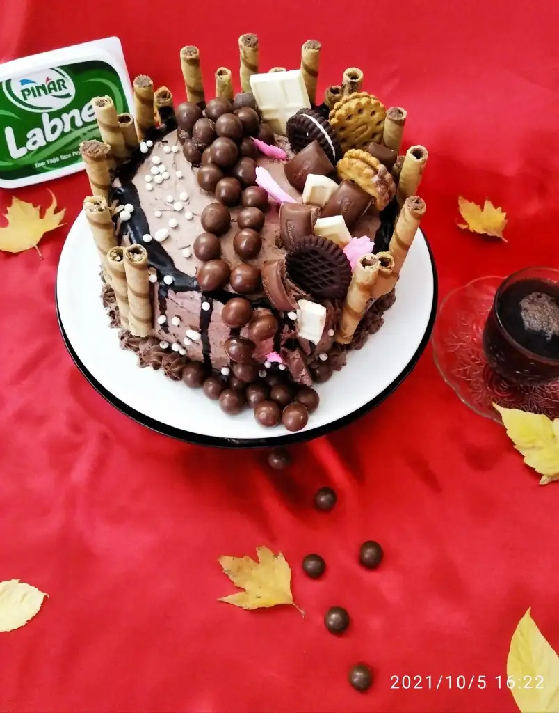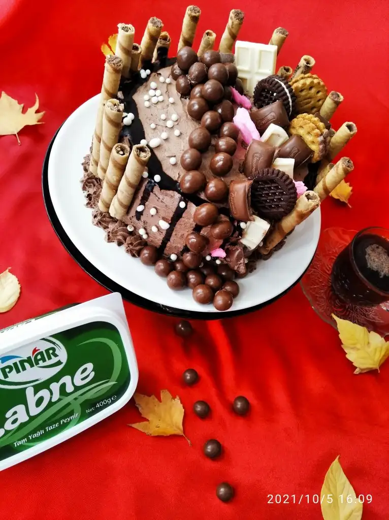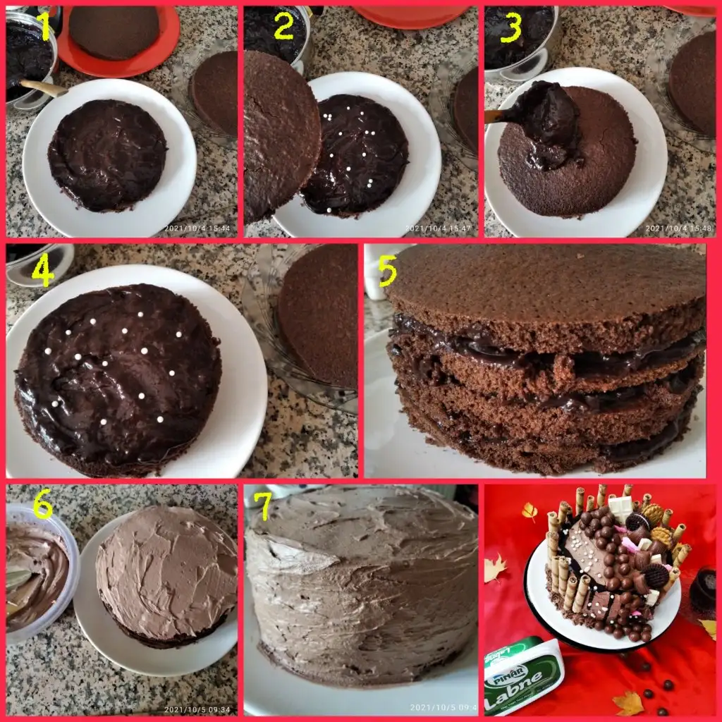 2.pandispanyamızı üzerine kapatıyoruz ve onunda üzerine kakaolu pudingimizi sürüp beyaz küçük çikolatalardan serpiyoruz .Bu şekilde 4 kat yapıyoruz ve üzerine kakaolu kremşantimizi ve çikolata Sosumuzu ilave ediyoruz ve süslemeler 🙃.