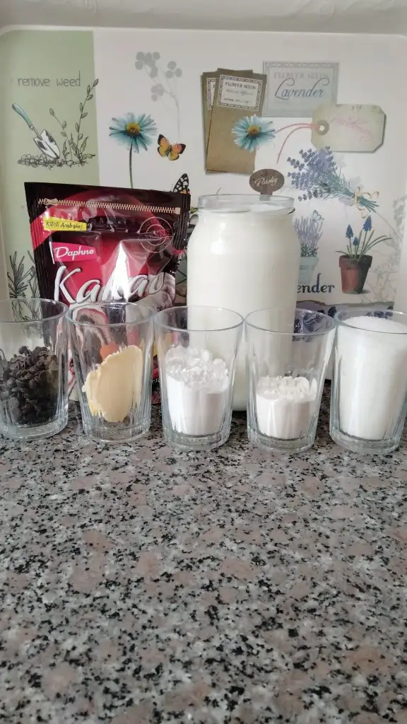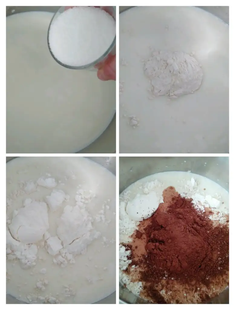 Öncelikle tenceremizden süt, un, nişasta, kakao ve şekeri ekleyip karıştırıp ocağın altını açıyoruz. Karıştırarak pişiriyoruz. Karıştırmazsak dibine tutar.