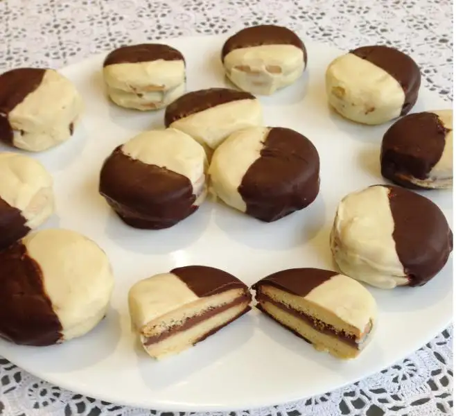 Sütlü beyaz çikolatayı benmari usulü eritin kurabiyelerin yarısını beyaz çikolataya batırıp çıkarın ve fırın kağıdı veya aleminyum folyonun üstünde dik duracak şekilde koyun bütün kurabiyelere aynı işlemi uygulayın ve çikolatanın üstünde sertleşmesini bekleyin.